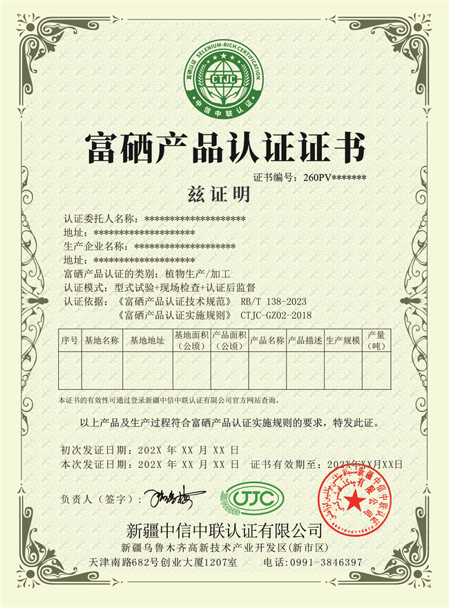 中信中聯(lián)-富硒產(chǎn)品認(rèn)證證書模版