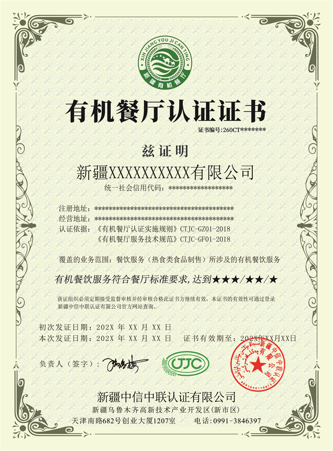 中信中聯(lián)-有機(jī)餐廳認(rèn)證證書(shū)模版
