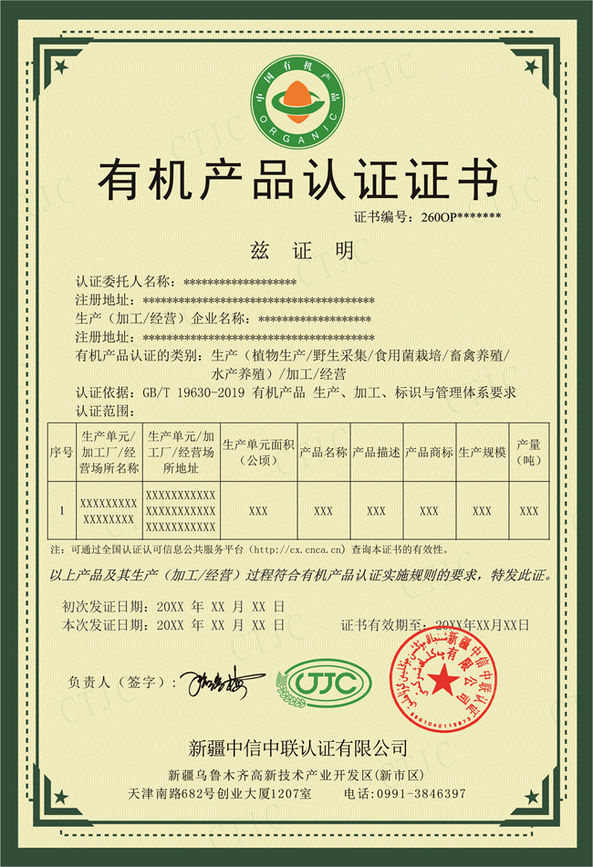 中信中聯(lián)-有機產(chǎn)品認(rèn)證證書模版